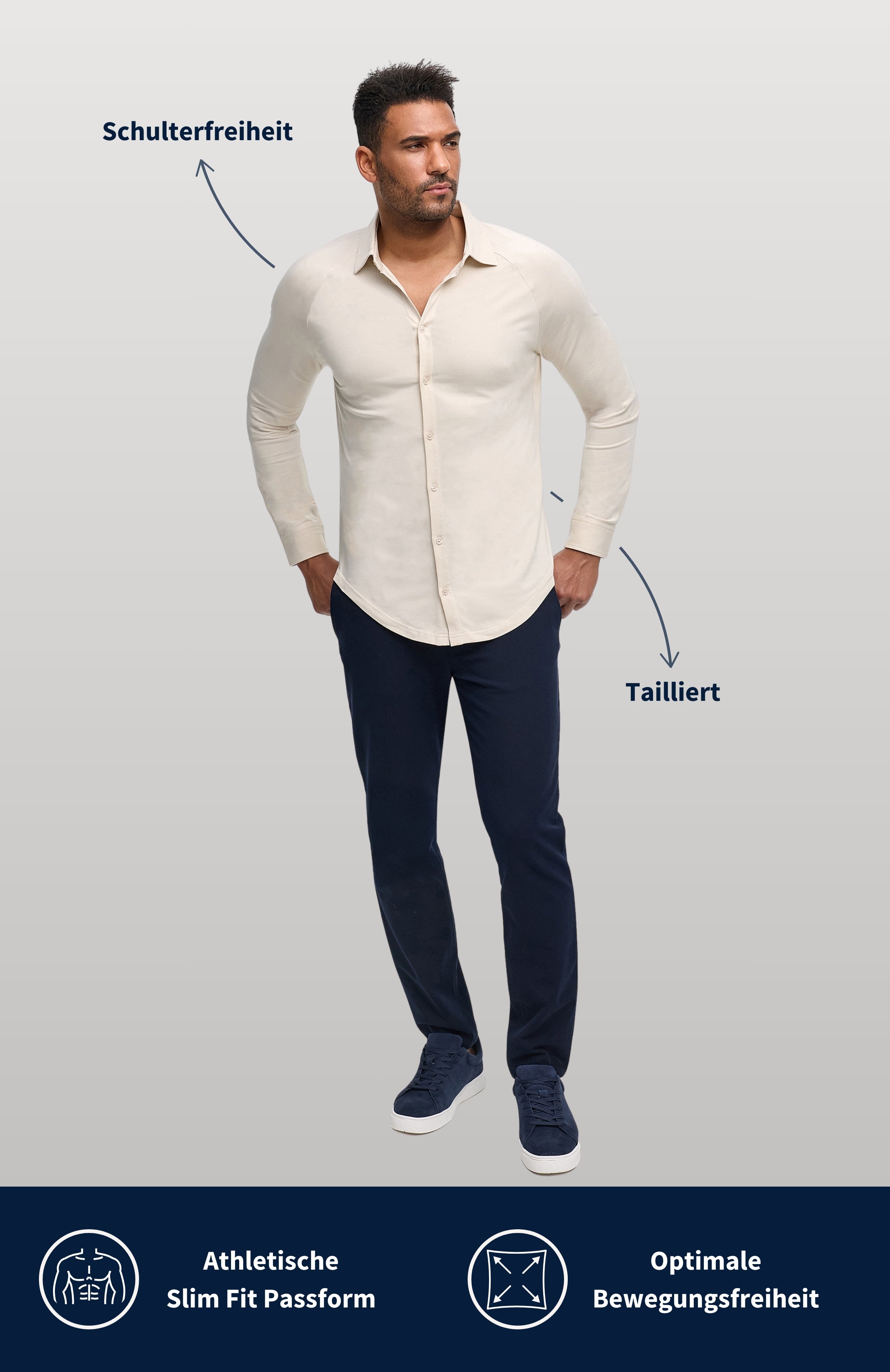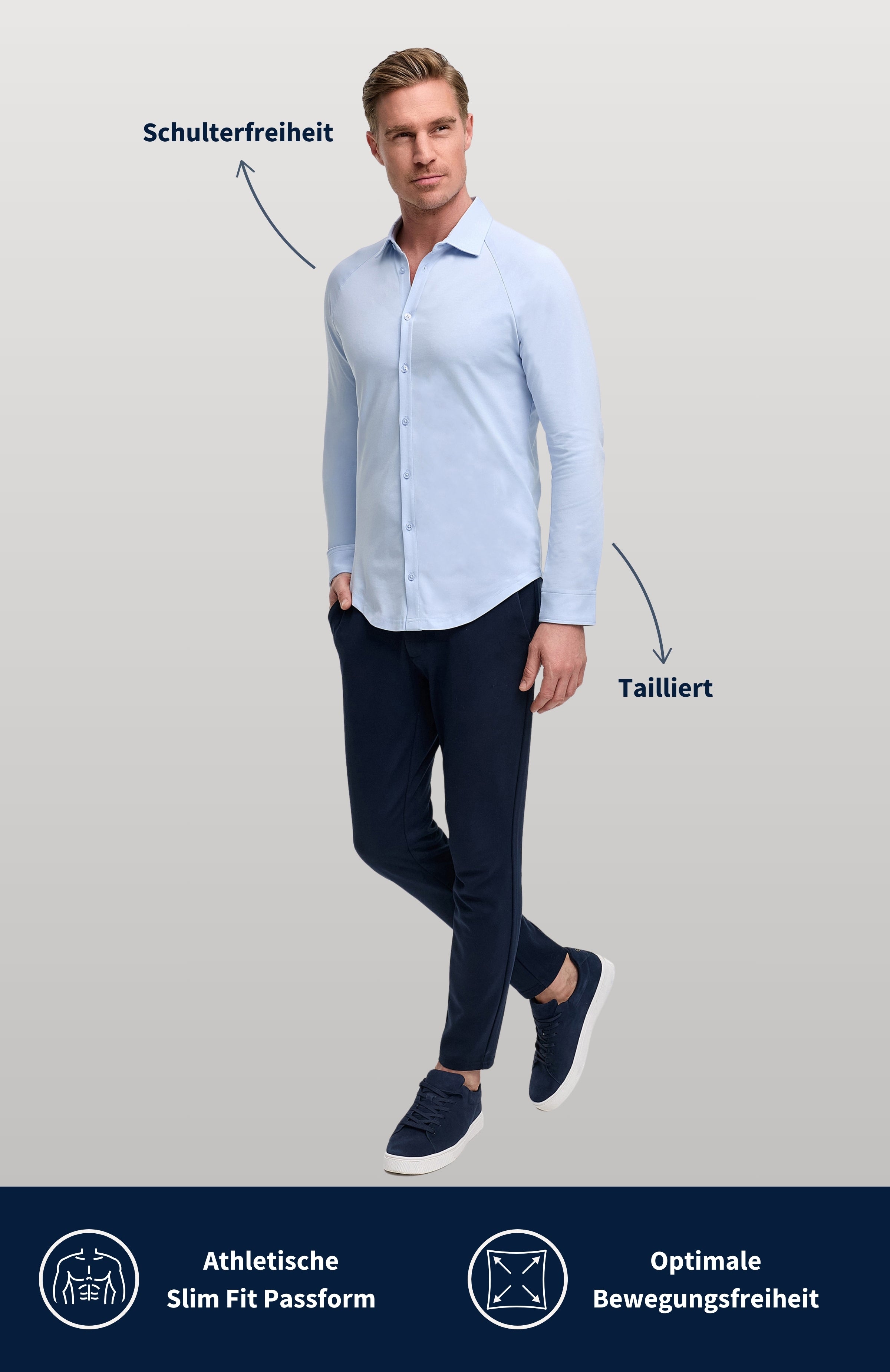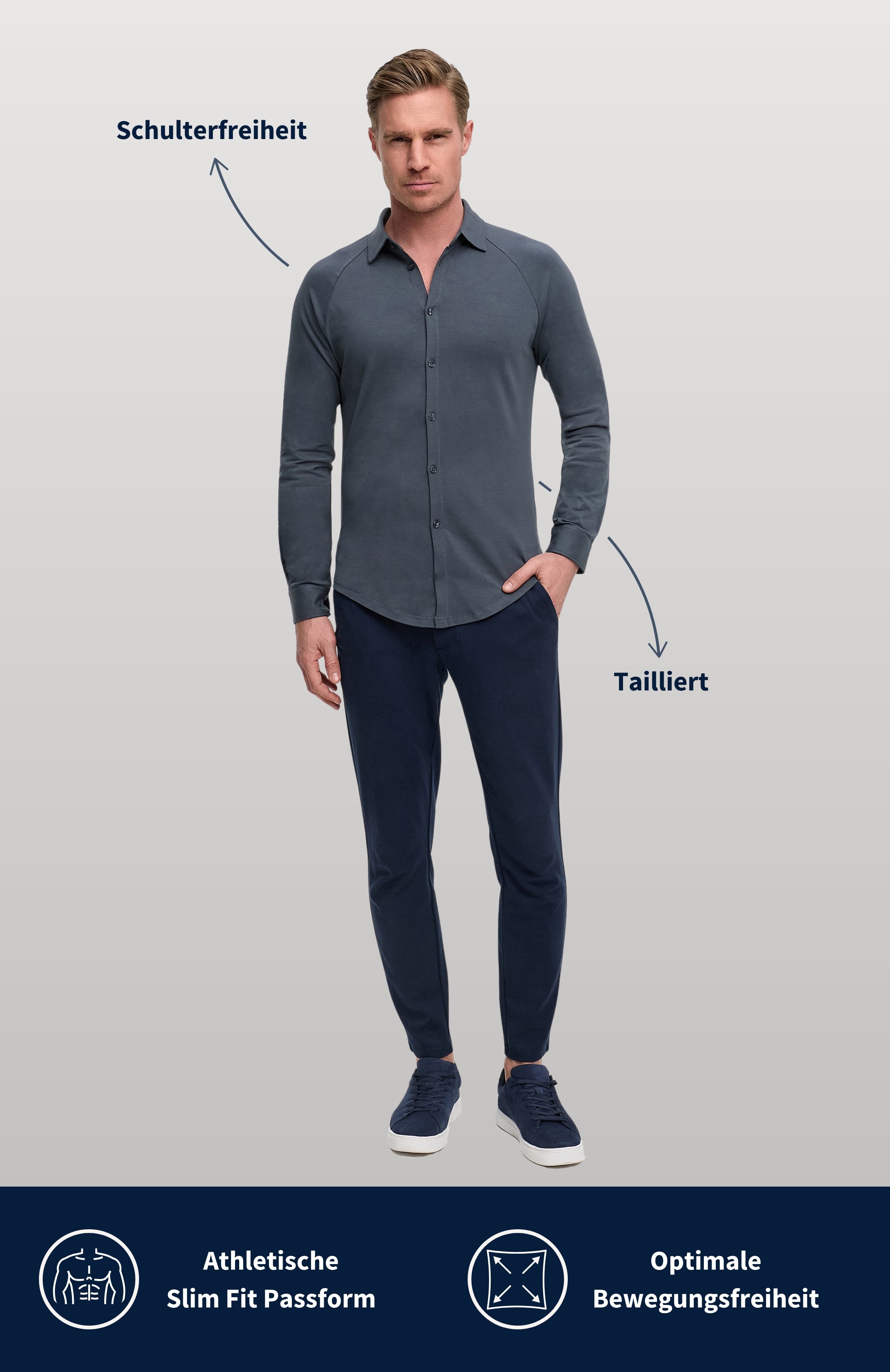 Unsere athletischen Jerseyhemden passen zu fast jedem Anlass. Ob beim Business-Meeting im Büro, im Homeoffice, auf einer stilvollen Hochzeit, bei einem spannenden Abend im Casino, beim romantischen Dinner mit deinem Date oder bei einem entspannten Bummel durch die City. Sie sind dein perfekter und bequemer Begleiter.
